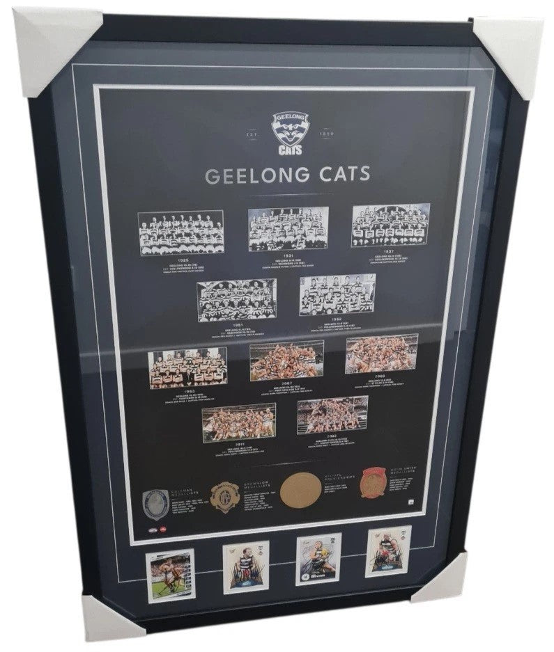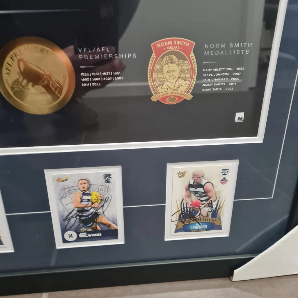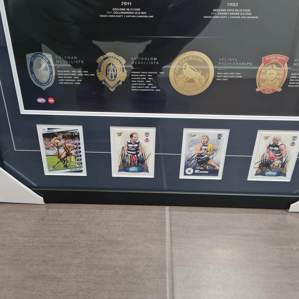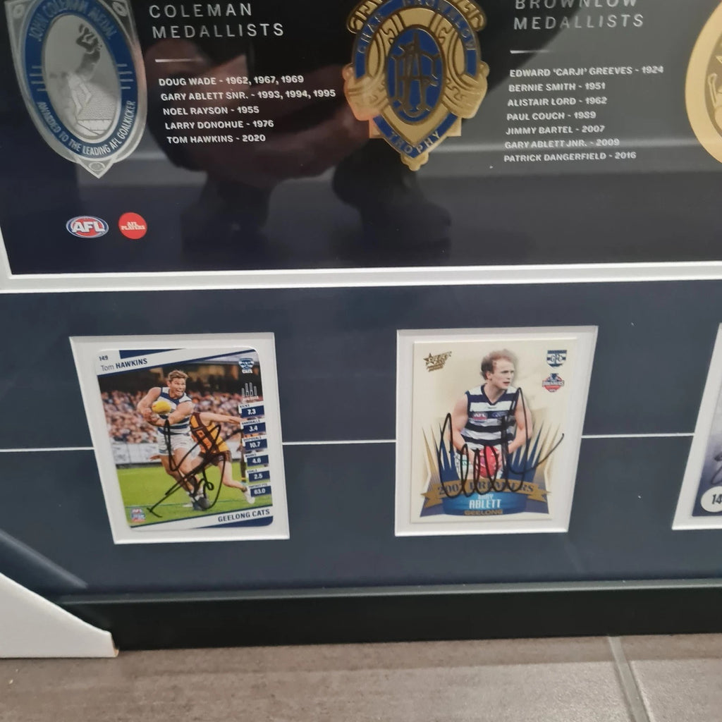With a hand Signed pieces including Tom Hawkins, Gary Ablett, Scott Selwood and Paul Chapman. This is a great keepsake of Geelong's Premierships.
