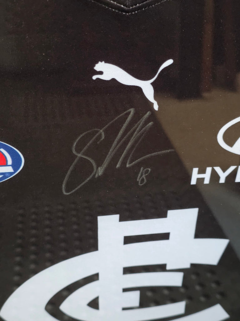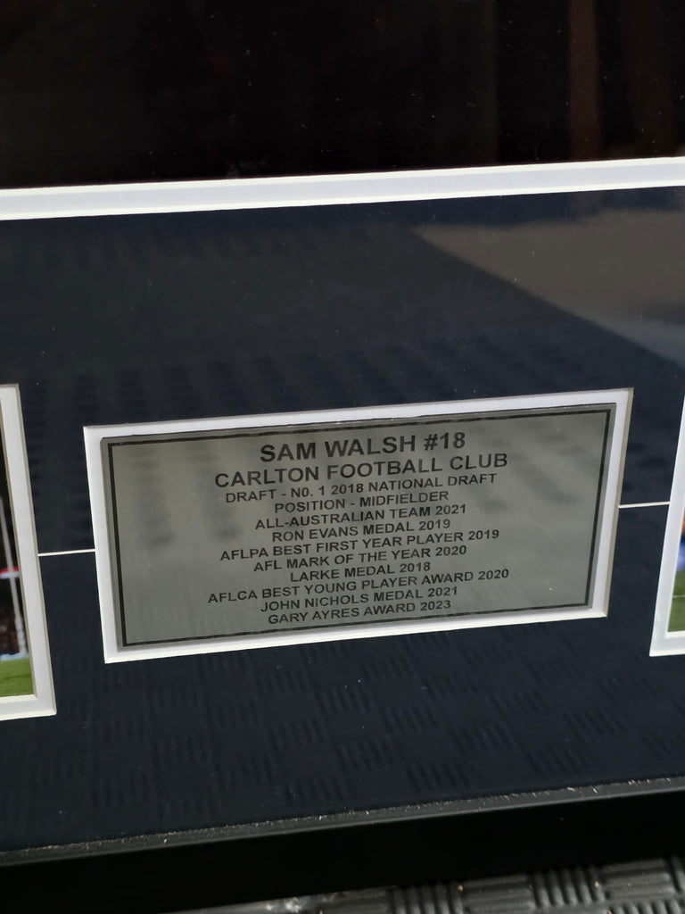 A beautifully signed & Framed Sam Walsh Carlton Jumper. With a plaque and accompanying pictures, this is a great piece for any Carlton fan.