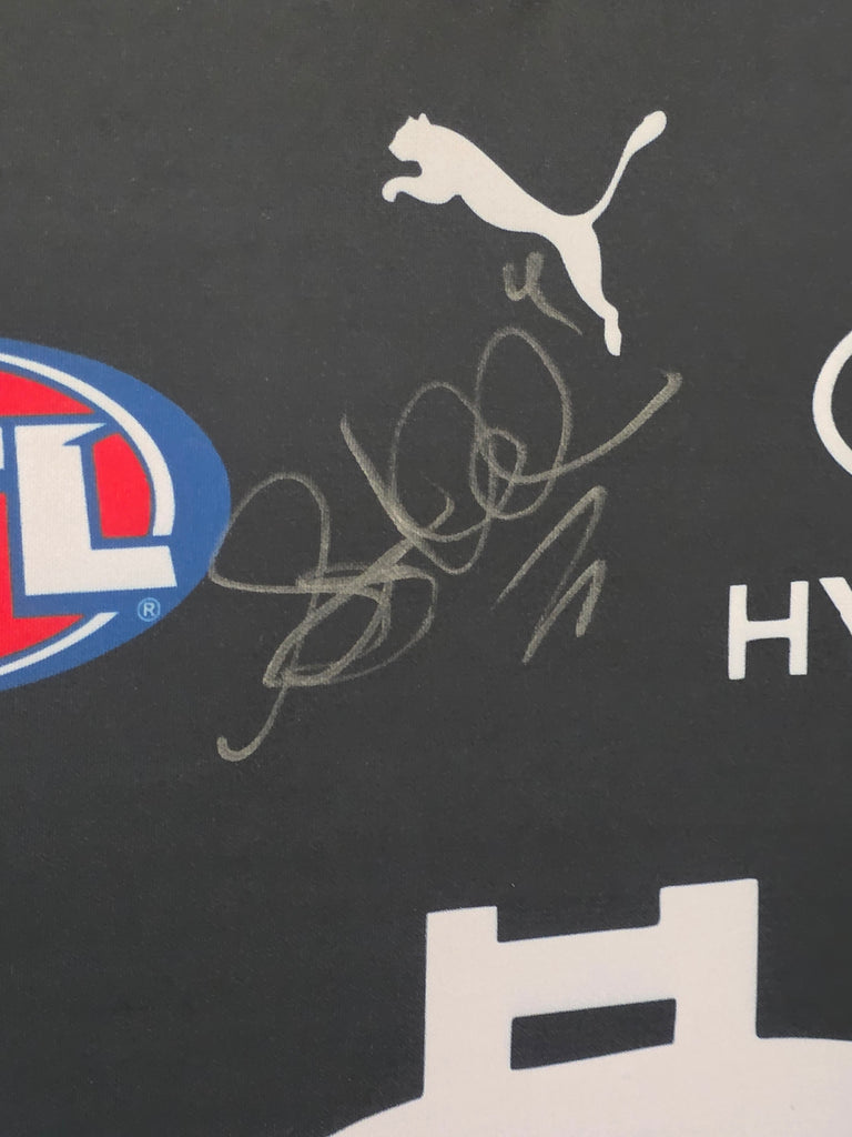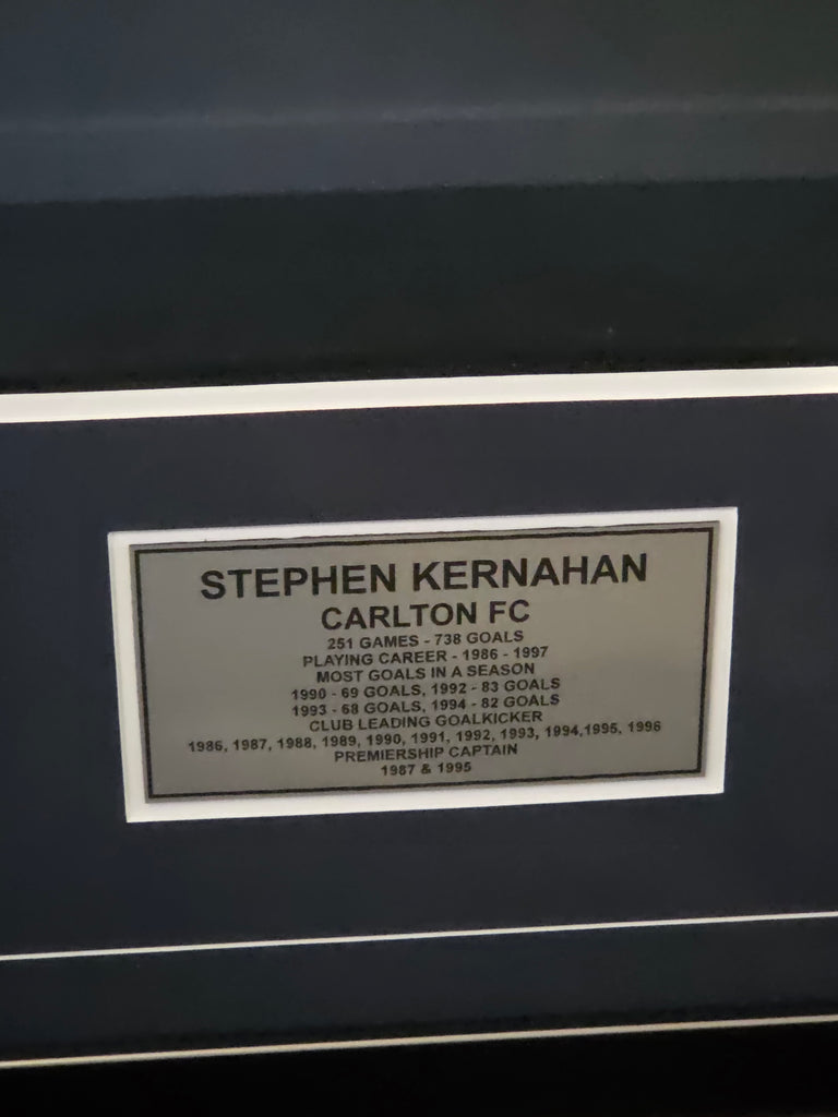 A beautifully signed & Framed Stephen Kernahan Carlton Jumper. With a plaque and accompanying pictures, this is a great piece for any Carlton fan.
