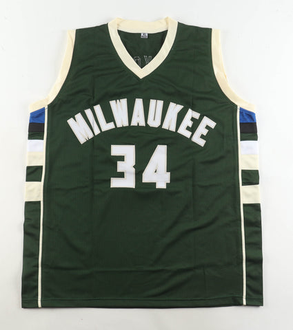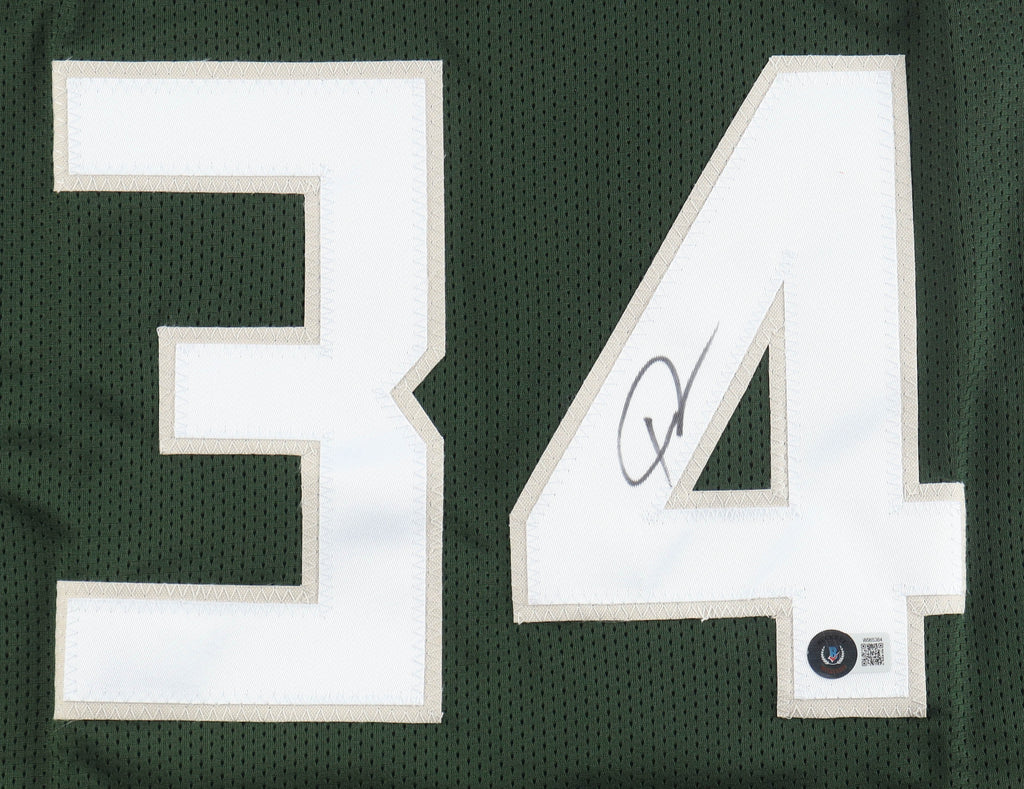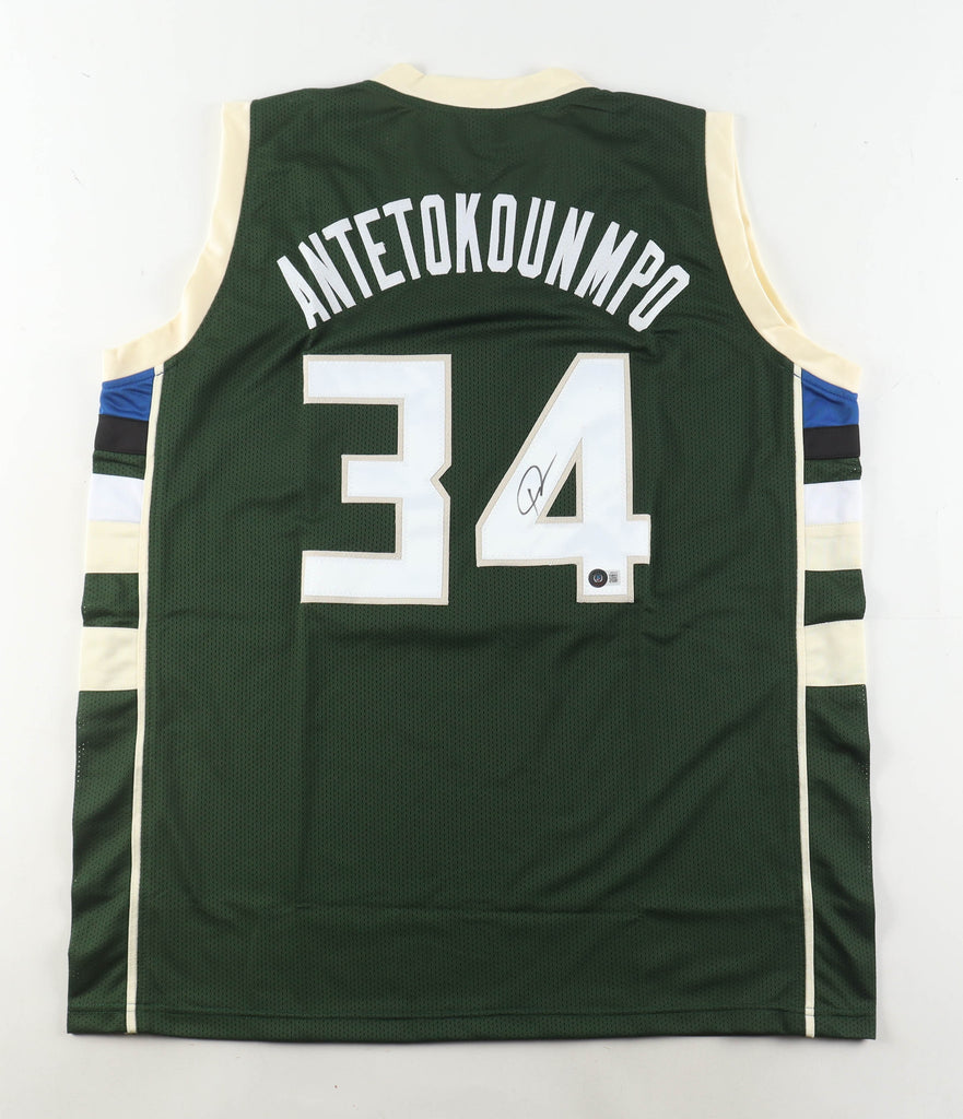 Custom jersey with everything sewn on, size XL. Hand-signed by Giannis Antetokounmpo.